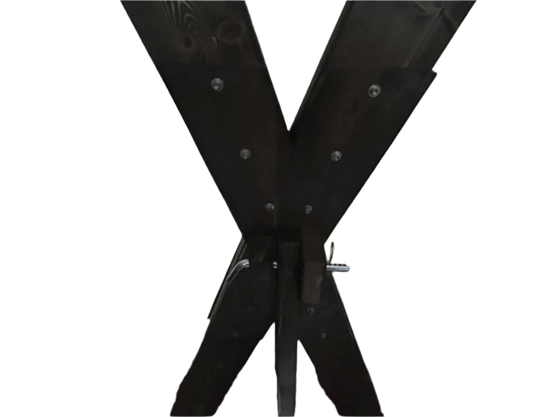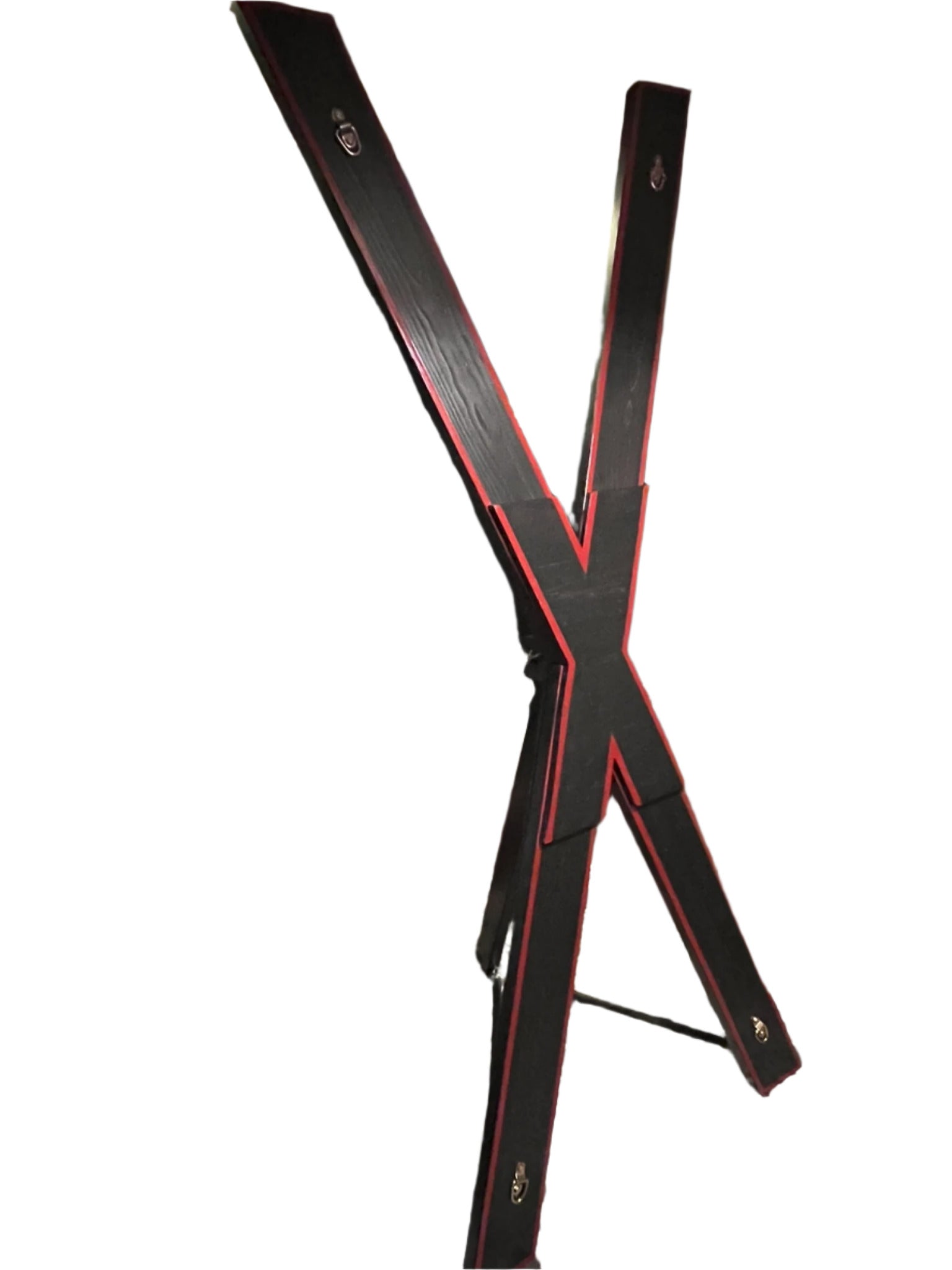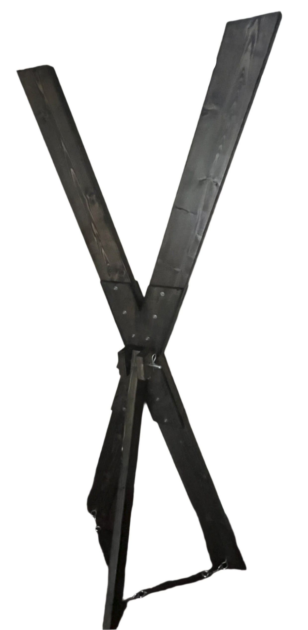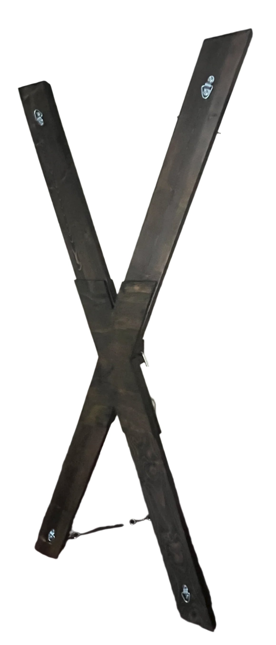 Made to order St. Andrews Cross that can be taken apart in just a couple minutes and stored in a closet or under your bed. It has 4 hard points each able to withstand 400lbs of force. I currently use a Jacobean or True Black stain for the base color.
