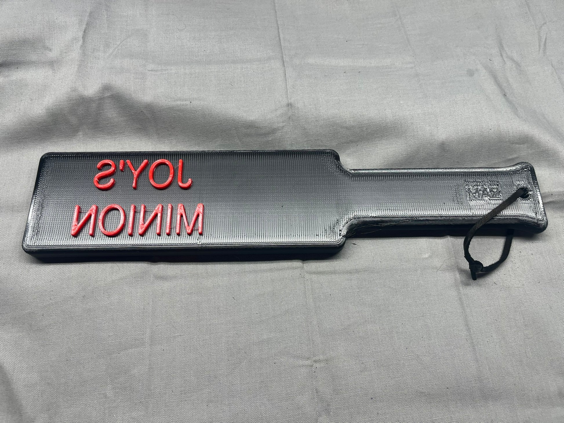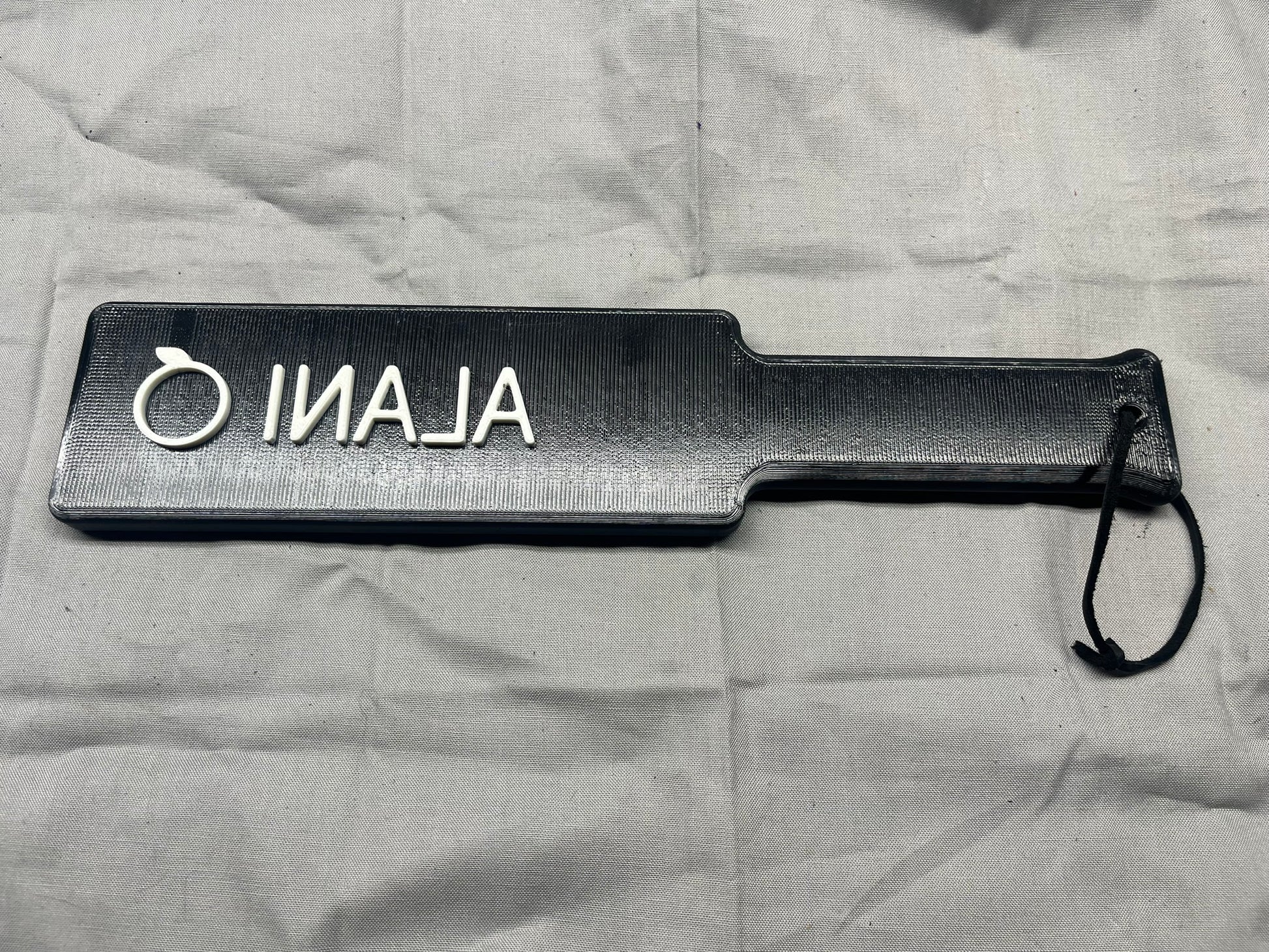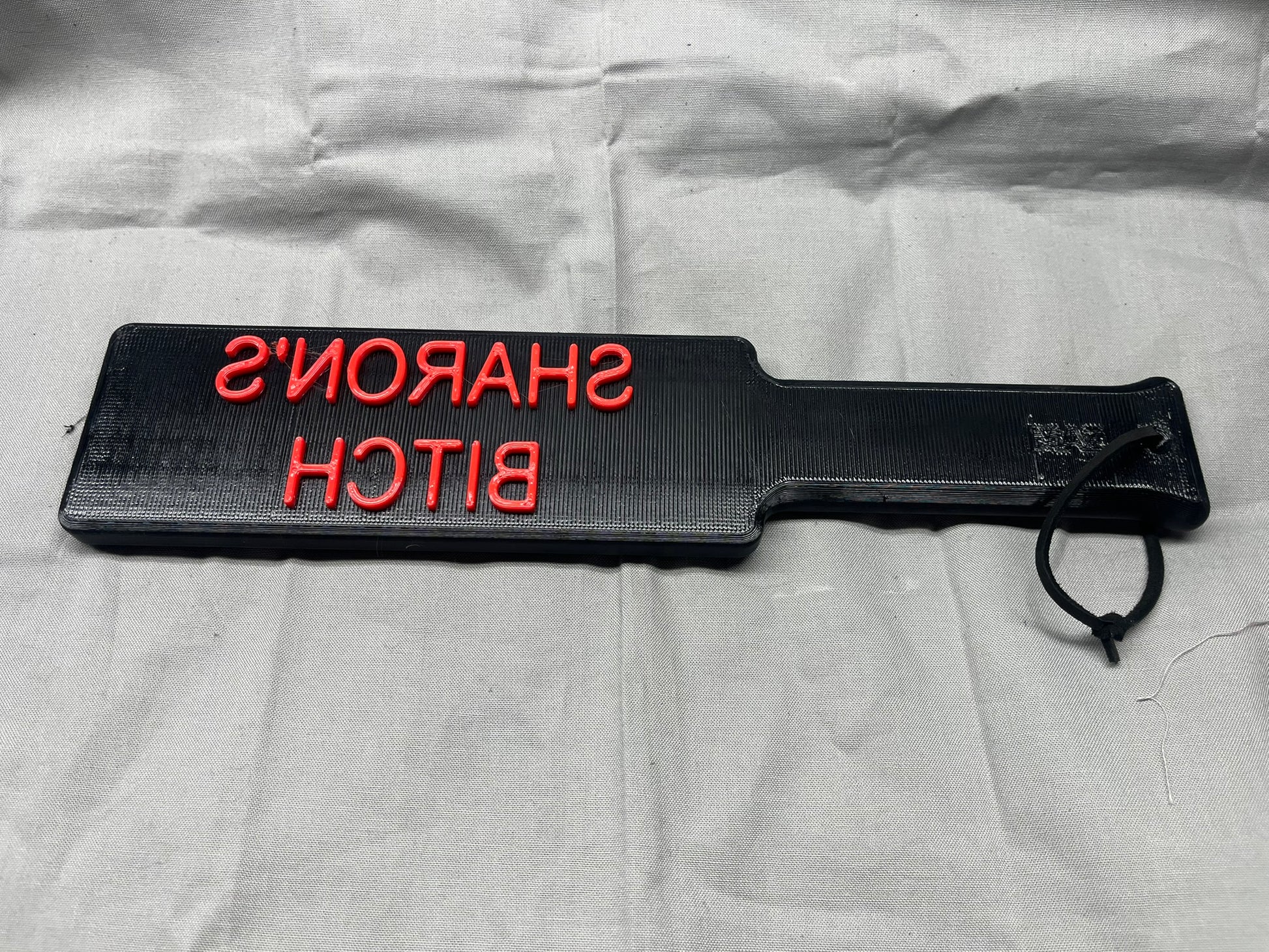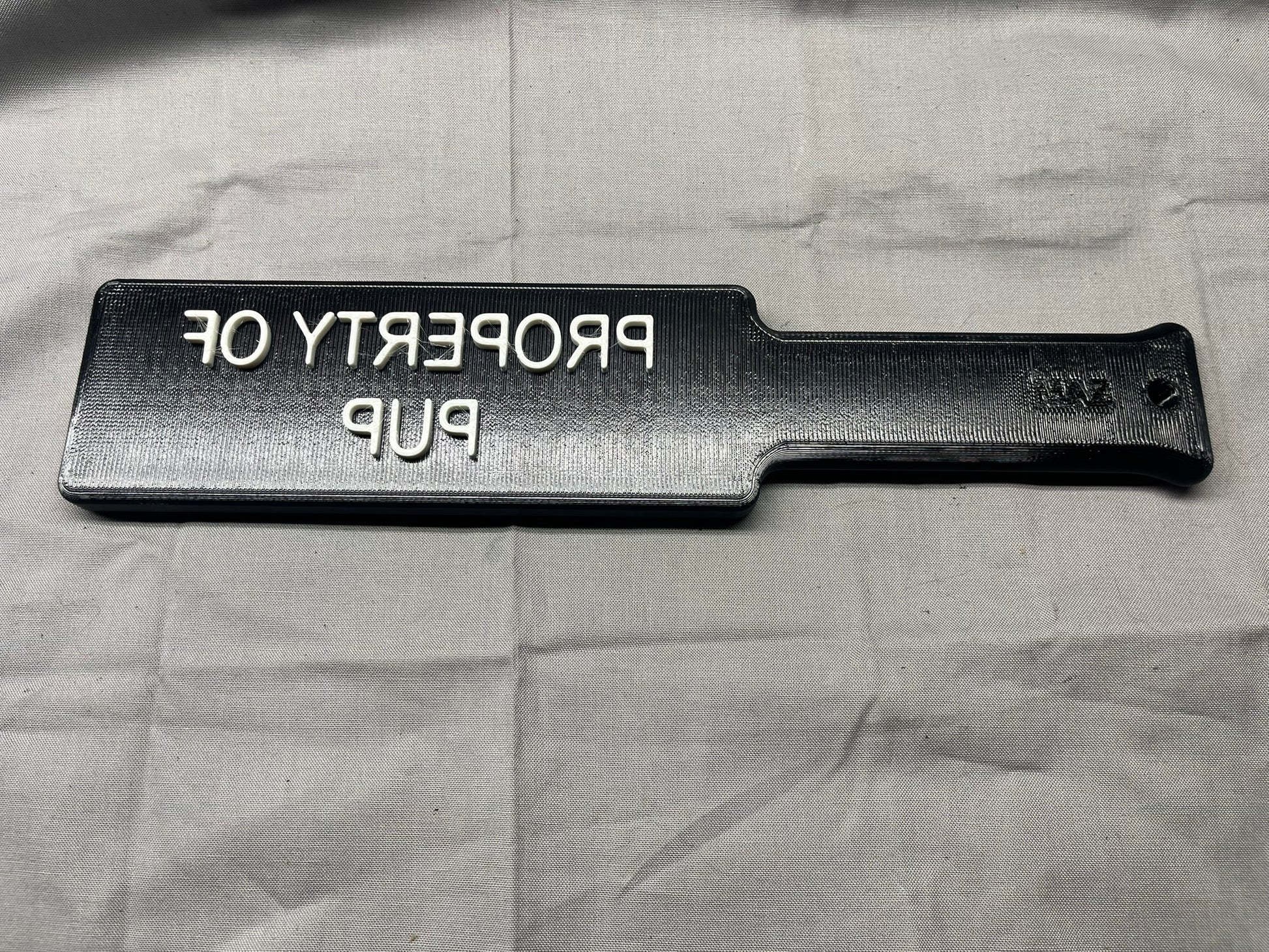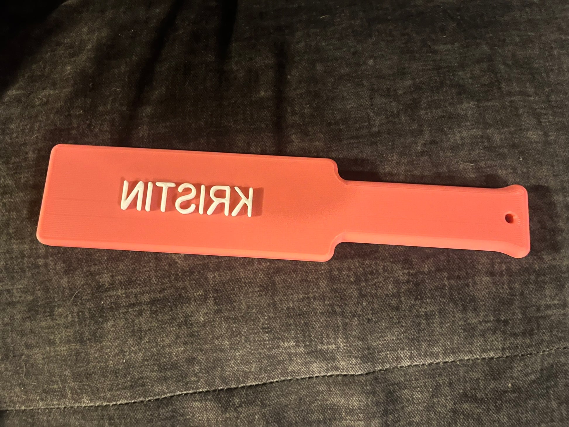The letter's are typically mirrored and offset so that after your sub has been spanked, the word(s) are legible to you! The word(s) will be legible when you hold the paddle in your right hand and swing it like a tennis racket forehand style.