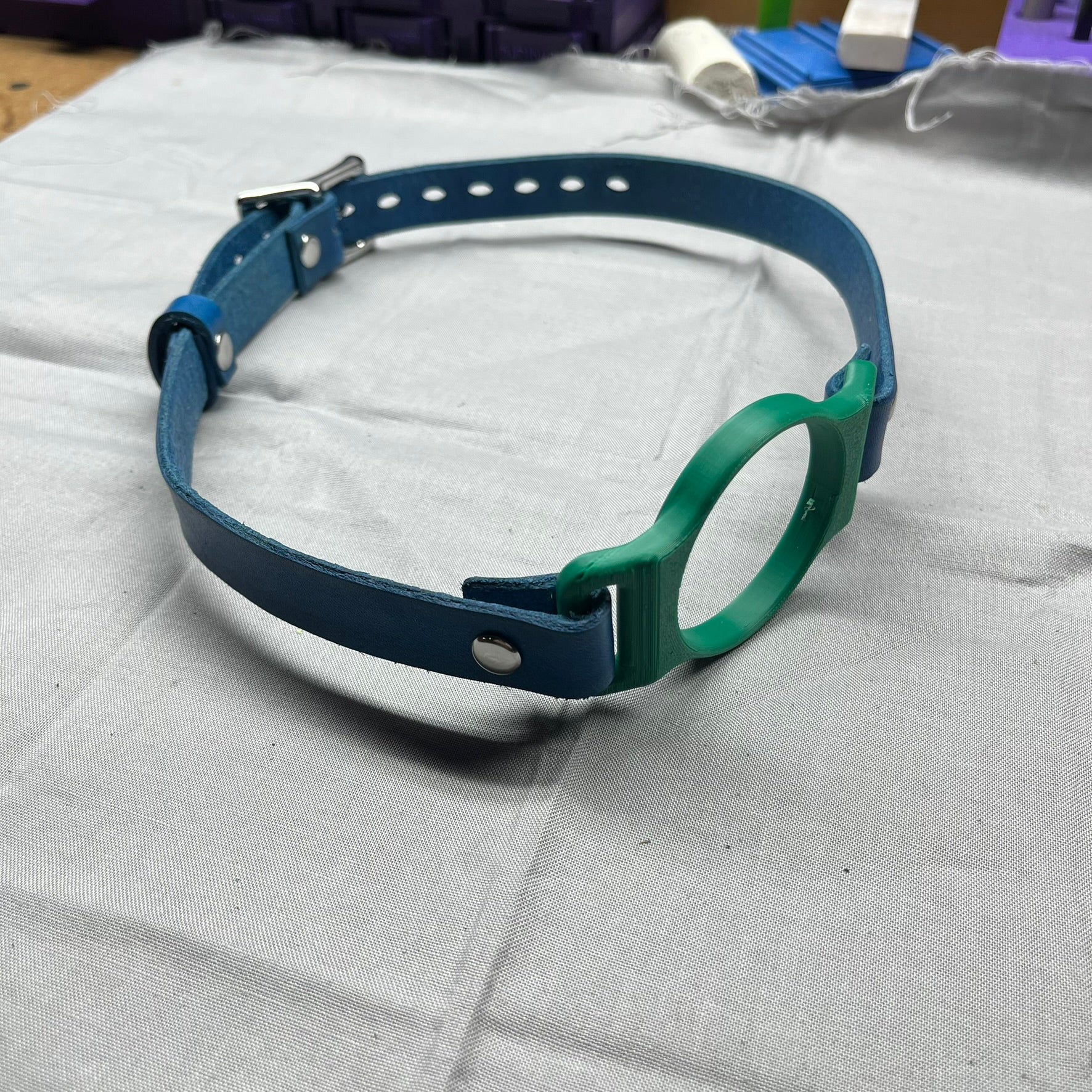 It's made with PLA (plastic) that was 3D printed, a vegetable tanned cow leather strap that was cut, stamped and dyed by hand in your choice of colors below.